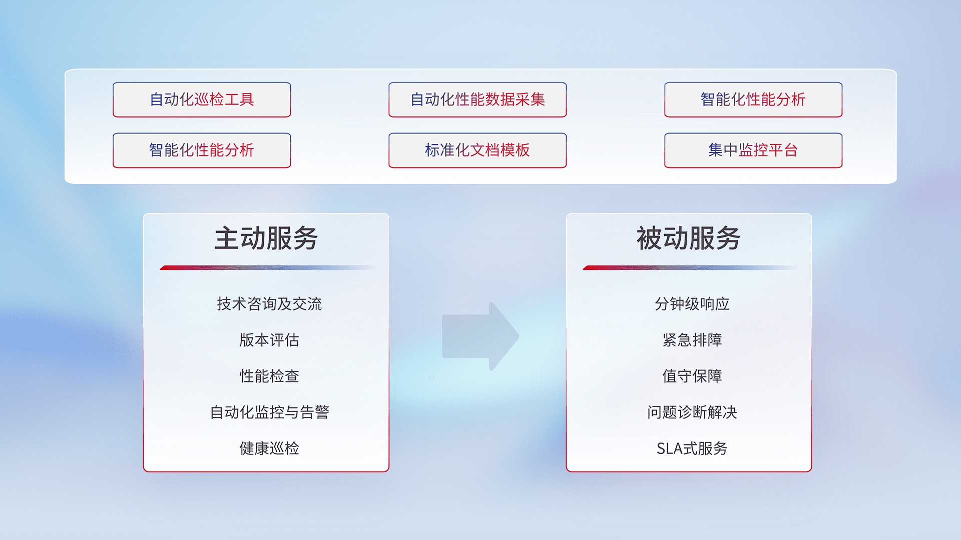 智能化工具和标准化文档,,,保障服务质量,,,提供主动服务(包含技术咨询、、、、版本评估、、、、性能检查、、、、自动化监控与告警、、、、健康巡检)和被动服务包含(分钟级响应、、、紧急排障、、值守保障、、、、问题诊断解决、、、SLA服务)。。